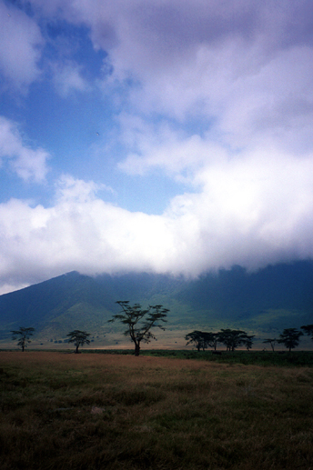 Like much of Africa, the Conservation Area has a wet and dry season. The wet season usually lasts between November and May. Between June and October, there is little rain. Our first trip to the area was in January 1991. We did not experience any rain and the temperatures were warm. June and July apparently are the coldest months in the area, with the temperatures becoming colder the higher you are, which we found out on our second trip in July 2003. We were quite surprised by how cold it was at night and cool during the day. Because of the cold at this time of year, moisture condenses and forms clouds around the rim of the Crater. This condition was prevalent during our stay in 2003, and the Crater floor usually was not visible from the rim, much to the disappointment of those in our group who were experiencing their first trip to Ngorongoro. They missed a spectacular view.