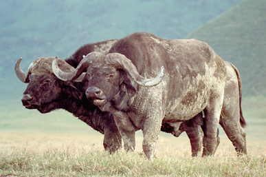 As I noted earlier, Ngorongoro is a paradise for game viewing, home to large herds of hoofed animals, as well as rhinos, elephants and predators. During our stay at Ngorongoro, we encountered a large herd of buffalo in one of the farther corners of the Crater. As we approached, the entire herd moved away, but several of the older animals surged back towards us. The three in front paid particularly close attention to our activities, never letting us out of their sight until we had moved on down the road. I imagined that they considered themselves the protectors of the other buffaloes in their herd, ready to attack if the need arose. I also imagined that they would be a nasty animal to confront, given the size of the massive horns on the top of their heads. |