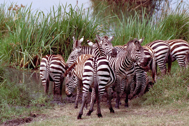 One afternoon, we approached a herd of zebra along one of the small streams that meanders through the Crater. The zebras were generally milling about and grazing on both sides of the stream. However, two of the males were clearly agitated with each other. One kept bothering the other, generally pushing him with his head or biting him. On at least two occasions, the victim (which I have labeled him although I may be incorrect) kicked the aggressor in the head, and with a substantial amount of force. The thuds of the hooves landing on the aggressor’s face could be heard in our land rover some seventy-five feet away. I do not know why the two were fighting, whether as part of a male dominance display or the one male trying to take over some females or for some other reason. The reasons were not readily apparent to an untrained eye such as mine, and Gary was not with us at that particular time to offer an explanation. |