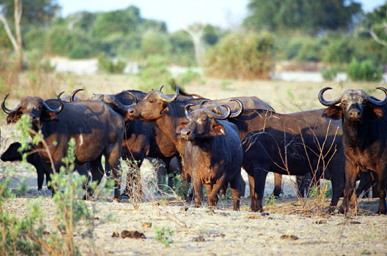 On our last evening at Sand Rivers, only four of us ventured out on a game drive. The sun was very low when we came across a herd of cape buffalo. Startled by our sudden appearance, they quickly moved away. However, when we approached the second time, they allowed us to do so without fleeing, although many of them kept a nervous eye on our vehicle. The herd was a wonderful sight, lit up with the soft glow of the setting sun. After a few minutes, we indicated to the driver that we could move on. Apparently the driver misunderstood and, to our surprise, drove the land rover into the middle of the herd. Buffalo scattered everywhere, kicking up a cloud of dust in their haste to escape. We followed them until they settled, but this time the entire herd was wary of our presence. Almost every buffalo turned toward us, obviously not comfortable with this experience. |